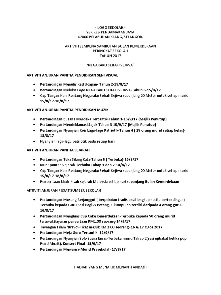 Kertas Candangan Sambutan Kemerdekaan Peringkat Sekolah Docx