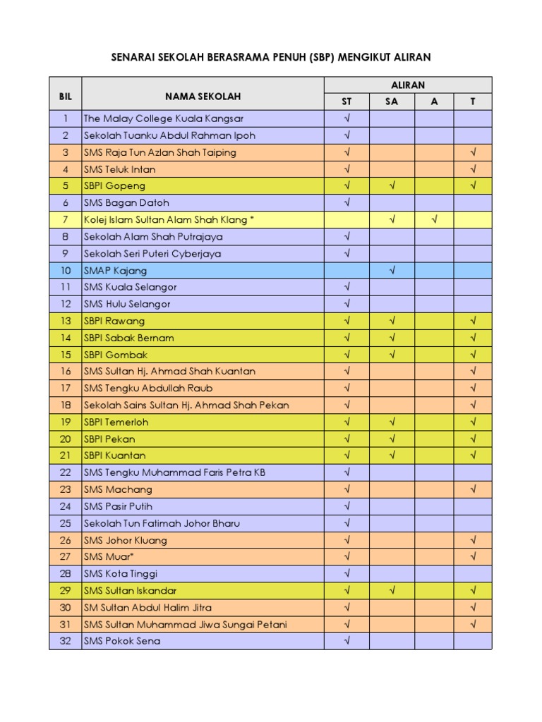 Senarai Sbp Mengikut Aliran