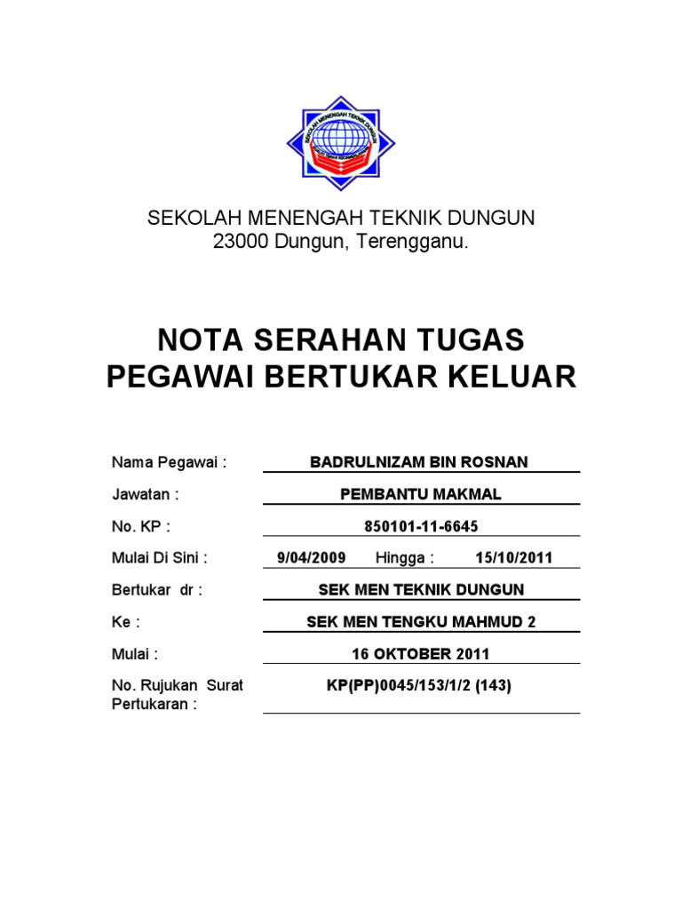 Doc Format Borang Serah Tugas Adika Roslan Academia Edu