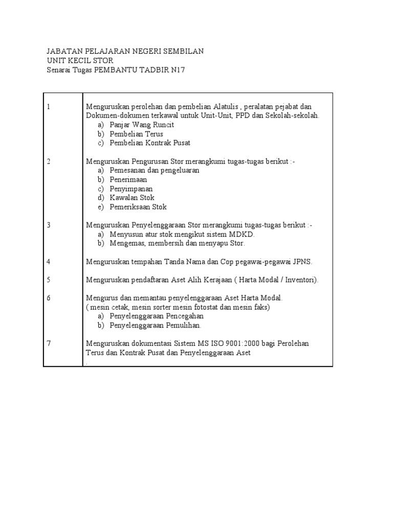 Deskripsi pembantu tadbir perkeranian operasi gred n19 jawatan pembantu tadbir gred n19 perkeranian operasi adalah salah satu jawatan kerajaan yang ramai dicari oleh pencari kerja di malaysia. Pengurusan diri 27 i. Kaji apakah tugas bagi pembantu tadbir ni. Kursus 2 hari ini akan menekankan kepada skop kerja seorang kerani pembantu tadbir secara lebih meluas.
