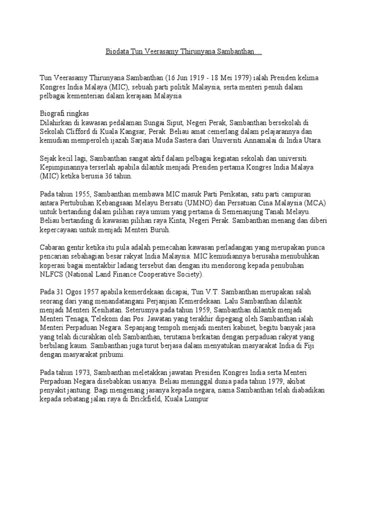 Biodata Tun Veerasamy Thirunyana Sambanthan