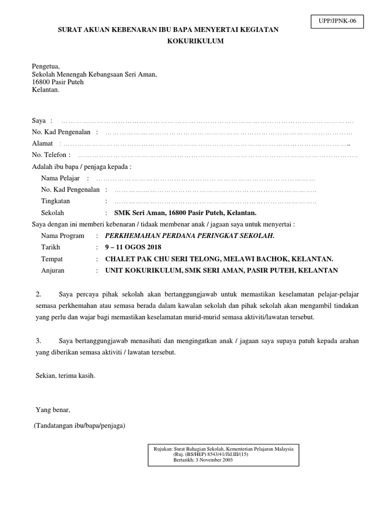 Surat Akuan Kebenaran Ibu Bapa Menyertai Kegiatan Kokurikulum