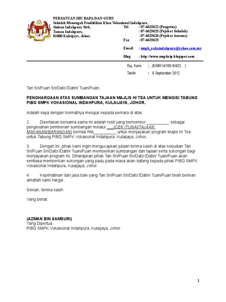 Contoh Surat Rasmi Ucapan Terima Kasih Rasmi Suh